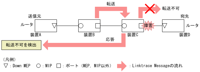装置AがLinktraceでの転送不可を検出した場合,ネットワーク上の送信側のポートが通信できない状態が考えられます。これは,装置Cが装置D(宛先)にLinktrace Messageを転送できなかった場合,装置Aに送信側ポートが通信できない旨の応答を返すためです。