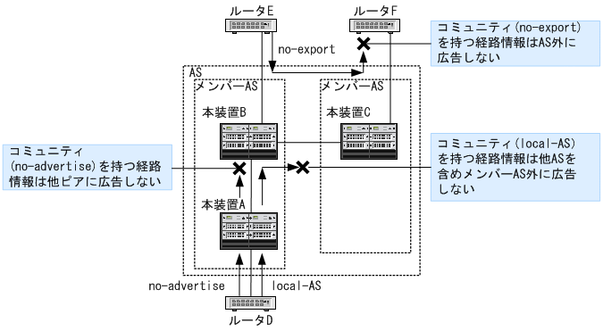 コンフェデレーション構成ではRFC1997で定義されるウェルノウン・コミュニティについて,次のように取り扱います。そのほかのコミュニティの取り扱いは,通常構成と同様です。