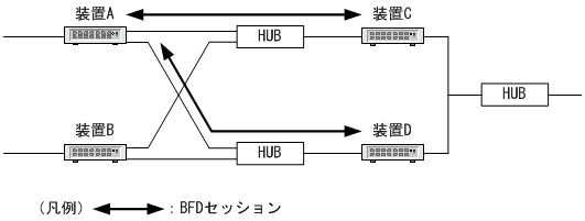 装置Aでは,装置Cと装置DをBFD監視対象として設定します。装置Cでは装置Aを,装置Dでも装置AをBFD監視対象として設定します。このとき,装置Aと装置C,装置Aと装置Dの間に,それぞれBFDセッションが生成されます。
