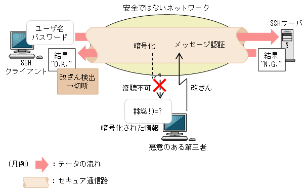SSHは,クライアントからサーバへ,安全ではないネットワーク上で,セキュアに接続する機能です。