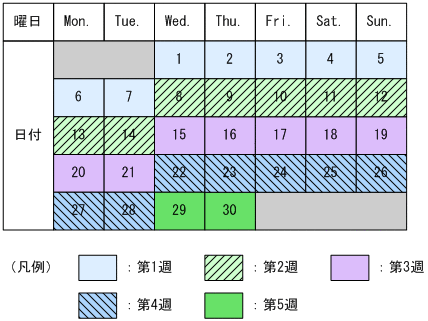 この例では,第1週が1日〜7日,第2週が8日〜14日,第3週が15日〜21日,第4週が22日〜28日,第5週が29日〜30日となります。第5週を設定したときにその曜日が第4週までしか存在しない場合,第4週の指定した曜日でサマータイムが開始または終了します。