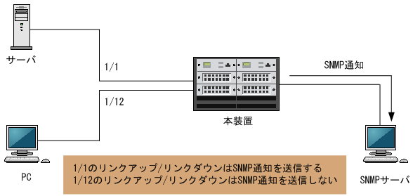 図16‒33 リンクトラップの構成図 ここでは,ポート1/1はSNMP通知を送信するので,コンフィグレーションの設定は必要ありません。ポート1/12はSNMP通知を送信しないように設定します。