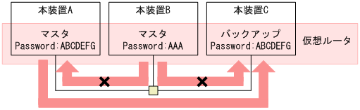 この図の例では仮想ルータBのパスワードが仮想ルータAおよび仮想ルータCと異なっているため,仮想ルータBから送信されたADVERTISEMENTパケットを仮想ルータAや仮想ルータCが受け取っても廃棄します。この場合,仮想ルータCは仮想ルータAからのADVERTISEMENTパケットだけを受信して処理します。そのため,ADVERTISEMENTパケット認証に失敗するような,不正に設置された仮想ルータの動作を防止できます。