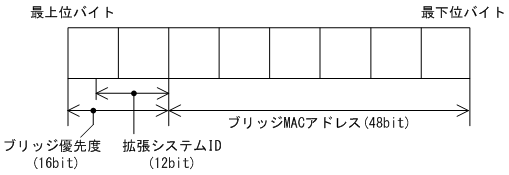ブリッジ識別子はブリッジ優先度(16bit)とブリッジMACアドレス(48bit)で構成されます。ブリッジ優先度の下位12bitは拡張システムIDです。拡張システムIDには,シングルスパニングツリー,マルチプルスパニングツリーの場合は0が設定され,PVST+の場合はVLAN IDが設定されます。ブリッジ識別子を次の図に示します。