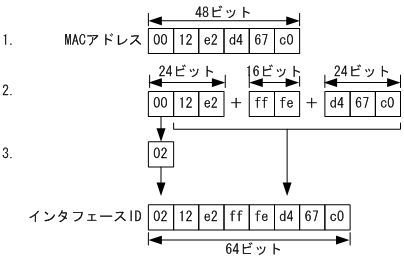 RAを受信した端末は,与えられたプレフィックスと各端末で固有である64ビットのインタフェースID(通常は48ビットのMACアドレスを基に生成)を組み合わせたグローバルアドレスを生成して,RAを受信したインタフェースに設定します。同時にRA送信元アドレス(=RAを送信したルータのインタフェースリンクローカルアドレス)を端末のデフォルトゲートウェイとして設定します。MACアドレスからのインタフェースID生成を次の図に示します。