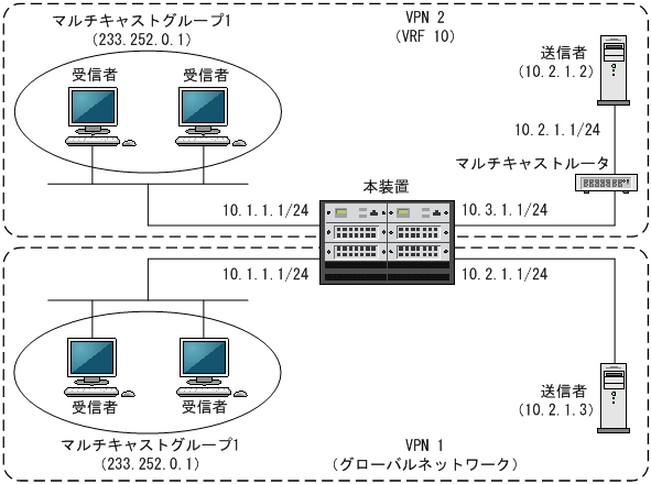 VPN 2にVRF 10を対応させ,VRF 10のインタフェースのIPv4アドレスを10.3.1.1/24とした場合のPIM-SMおよびPIM-SSM構成例を次の図に示します。