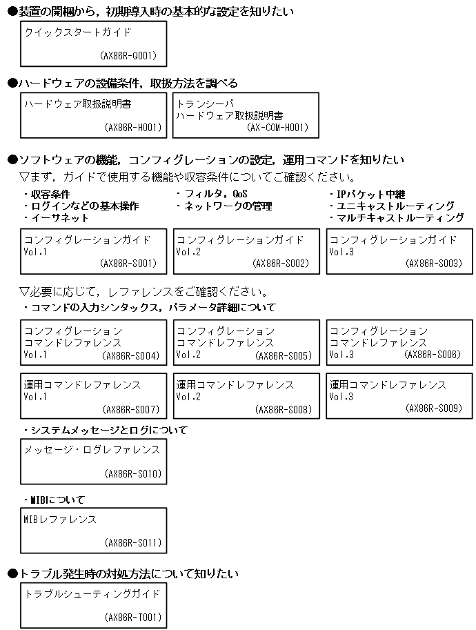 このマニュアルはAX8600RのソフトウェアVer. 12.9の機能について記載しています。ソフトウェア機能のうち,オプションライセンスで提供する機能については次のマークで示します。