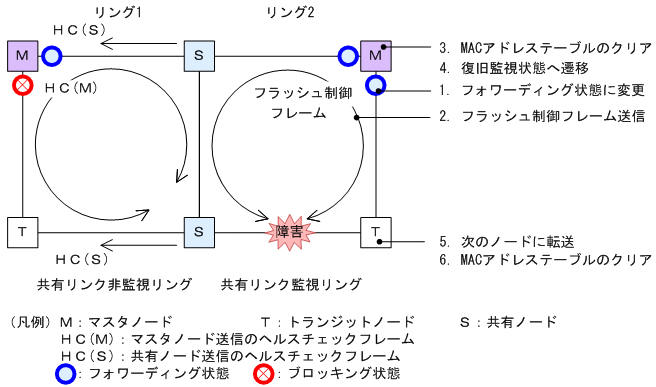 共有リンク監視リング内で障害が発生すると,マスタノードは両方向のHC(M)を受信できなくなり,リング障害を検出します。障害を検出したマスタノードはシングルリング時と同様に,次に示す手順で障害動作を行います。
