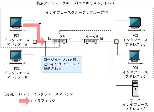 インタフェースの集合を示すアドレスです。終点アドレスがエニキャストアドレスのパケットは,インタフェースグループのうち,経路制御プロトコルによって測定された距離の最も近いインタフェースに配送されます。なお,本装置ではエニキャストアドレスは未サポートです。エニキャストアドレス通信を次の図に示します。