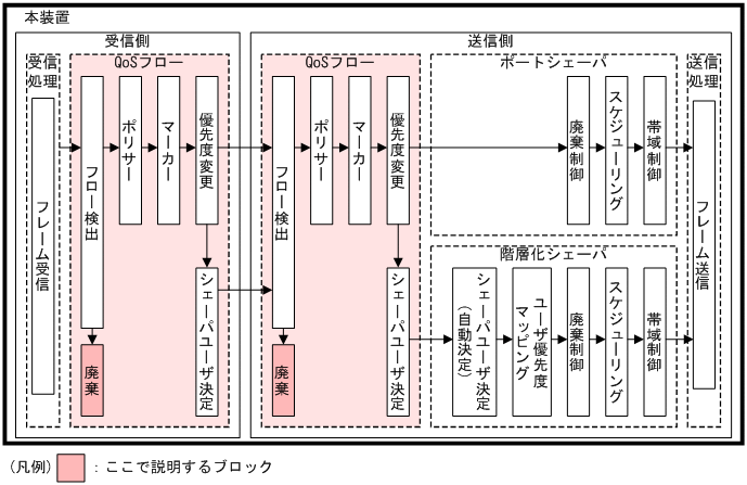 QoSフロー廃棄は,フロー検出で検出したフローを廃棄する機能です。ここで説明するQoSフロー廃棄の位置づけを次の図に示します。