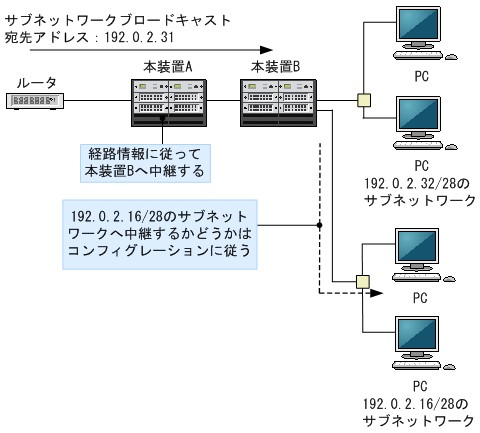 例えば,192.0.2.0/24のネットワークをサブネットワーク化して,192.0.2.16/28,192.0.2.32/28の二つのサブネットワークに分割して使用している場合に,192.0.2.31を宛先とするサブネットワークブロードキャスト(サブネットワーク192.0.2.16/28へのブロードキャスト)のIPパケットが送信された場合,本装置が192.0.2.16/28のサブネットワークと直接接続しているときはコンフィグレーションのブロードキャストを中継するかどうかの設定に従って,サブネットワークブロードキャストのIPパケットを自装置配下へ中継するかどうかを判断します。サブネットワークブロードキャストを次の図に示します。