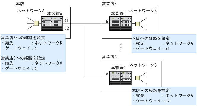スタティックルーティングのネットワーク構成例を次の図に示します。本店からは各営業店へのスタティック経路を設定して,営業店からは本店へのスタティック経路を設定します。この設定例では,営業店間は通信できません。
