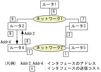 コスト値は,パケット送信方向によって異なってもかまいません。「図19-2 トポロジとコストの設定例」のルータ2−ルータ4間のポイント−ポイント型接続では,ルータ2からルータ4へはコスト9,ルータ4からルータ2へはコスト8となっています。ルータ−ネットワーク間の接続では,ルータからネットワークへの接続だけ,コストを設定できます。ネットワークからルータへのコストは常に0です。