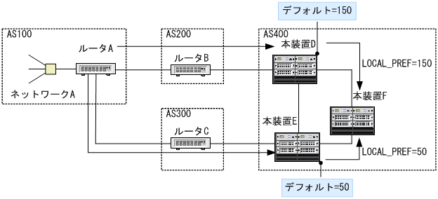この図で,AS400はAS200とAS300からネットワークAに対する経路情報を受信します。本装置DのLOCAL_PREF値を150に,本装置EのLOCAL_PREF値を50に設定した場合,本装置DはAS200からの経路情報を本装置Fに通知するときLOCAL_PREF値を150に,本装置EはAS300からの経路情報を本装置Fに通知するときLOCAL_PREF値を50に設定します。この結果,本装置Dからの経路情報が本装置Eからの経路情報より大きいLOCAL_PREF属性値を持つため,本装置FではネットワークAへの経路情報として,本装置Dからの経路情報(AS200経由の経路情報)を選択します。