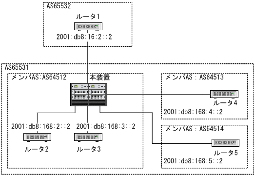 ルータ1を外部ピア,ルータ2およびルータ3を内部ピア,ルータ4およびルータ5をメンバーAS間ピアとして,BGP4+ピアを設定します。