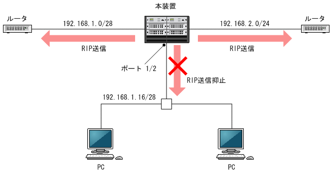 図15‒14 RIPパケットの送信抑止 PCは本装置向きにデフォルト経路を設定しているため,RIPの学習は不要です。
