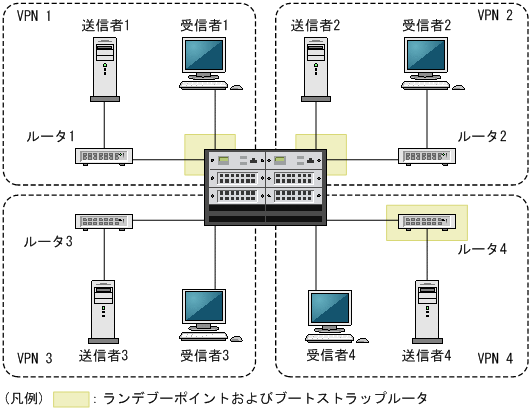 本装置を複数のVPNに接続して,それぞれのVPN上でマルチキャストを使用できます。VPNごとにVRFを設定して,それぞれのVRFでマルチキャストを動作させます。VRF上のマルチキャストでは,ランデブーポイント,ブートストラップルータ,各種タイマ,PIM-SSMで使用するアドレス範囲などにそれぞれ異なる設定ができます。