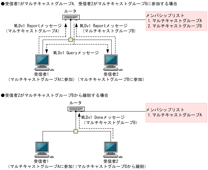 MLDv1マルチキャストグループの参加および離脱動作を次の図に示します。