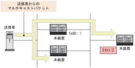本装置でマルチキャスト経路情報を確認する場合は,show ipv6 mrouteコマンドを実行して,該当するマルチキャスト経路情報が存在することを確認してください。コマンドの実行結果を次の図に示します。