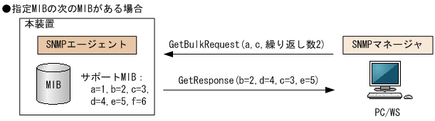 装置が,指定したMIBの次の項目から指定した繰り返し回数個分のMIBを保持している場合は,GetResponseオペレーションでMIBを応答します。指定したMIBが最後の場合,または繰り返し数に達する前に最後のMIBになった場合,GetResponseオペレーションでMIB値にendOfMibViewを応答します。GetBulkRequestオペレーションを次の図に示します。