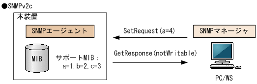 各ケースによって,応答が異なります。MIBが読み出し専用の場合,noSuchNameのGetResponse応答をします。SNMPv2Cの場合,MIBが読み出し専用のときはnotWritableのGetResponse応答をします。MIBが読み出し専用の場合のSetRequestオペレーションを次の図に示します。